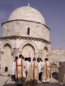 Apóstolos (At 1, 6-12), se encontra no cume do Monte das Oliveiras. Uma capelinha, que está nas mãos dos muçulmanos, tem origem na época bizantina, séc. IV. Depois, os cruzados construíram uma pequena igreja octogonal, com a cúpula aberta, simbolizando a subida de Jesus ao céu. Tempos mais tarde, tomada pelos muçulmanos, esses construíram uma cobertura, que está até os dias de hoje. No seu interior há uma pedra, que traz o sinal de uma marca de pé. Na fé e na tradição popular, seria essa a marca do local da Ascensão de Jesus ao céu.